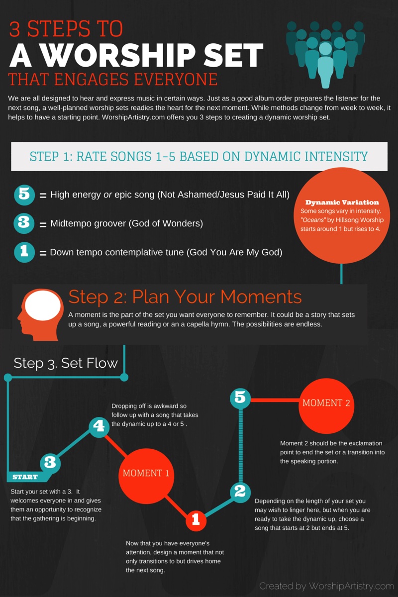 We are all designed to hear and express music in certain ways. Just as a good album order prepares the listener for the next song, a well-planned worship set readies the heart for the next moment. While melodies change from week to week, it helps to have a starting point. These are 3 steps to creating a dynamic worship set.