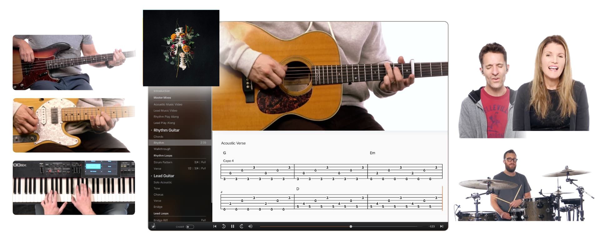 Lessons have arrangements for acoustic guitar, drums, bass, keyboard, electric guitar, and 3 part vocal harmony. Plus, transposable chord charts, sheet music, and tabs.