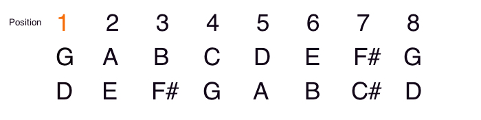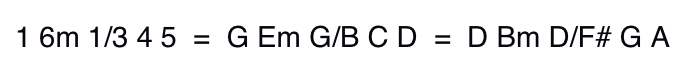 Once you have those numbers you can quickly and easily swap in the new chords. So let's try it with G and D. First we lay out the scale: