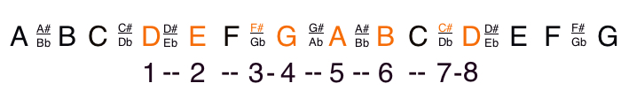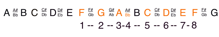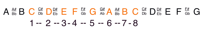 Let's start with the basics. The musical alphabet starts at A and goes to G#, then repeats. It looks like this. (Keep in mind that A# and Bb are different names for the same note.)