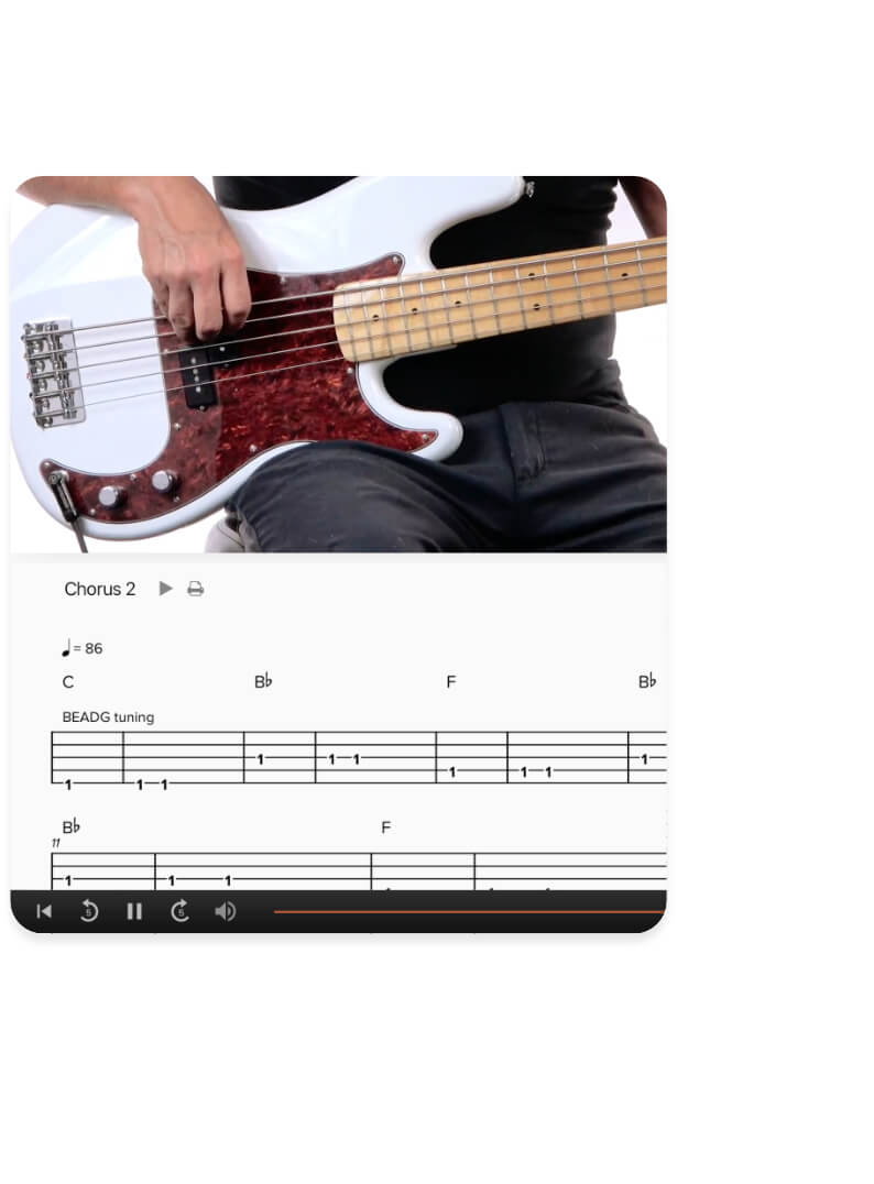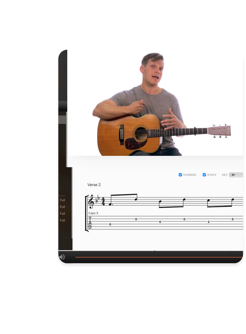 Accurate transposable tablature and sheet music in easy-to-memorize sections never leave you guessing.