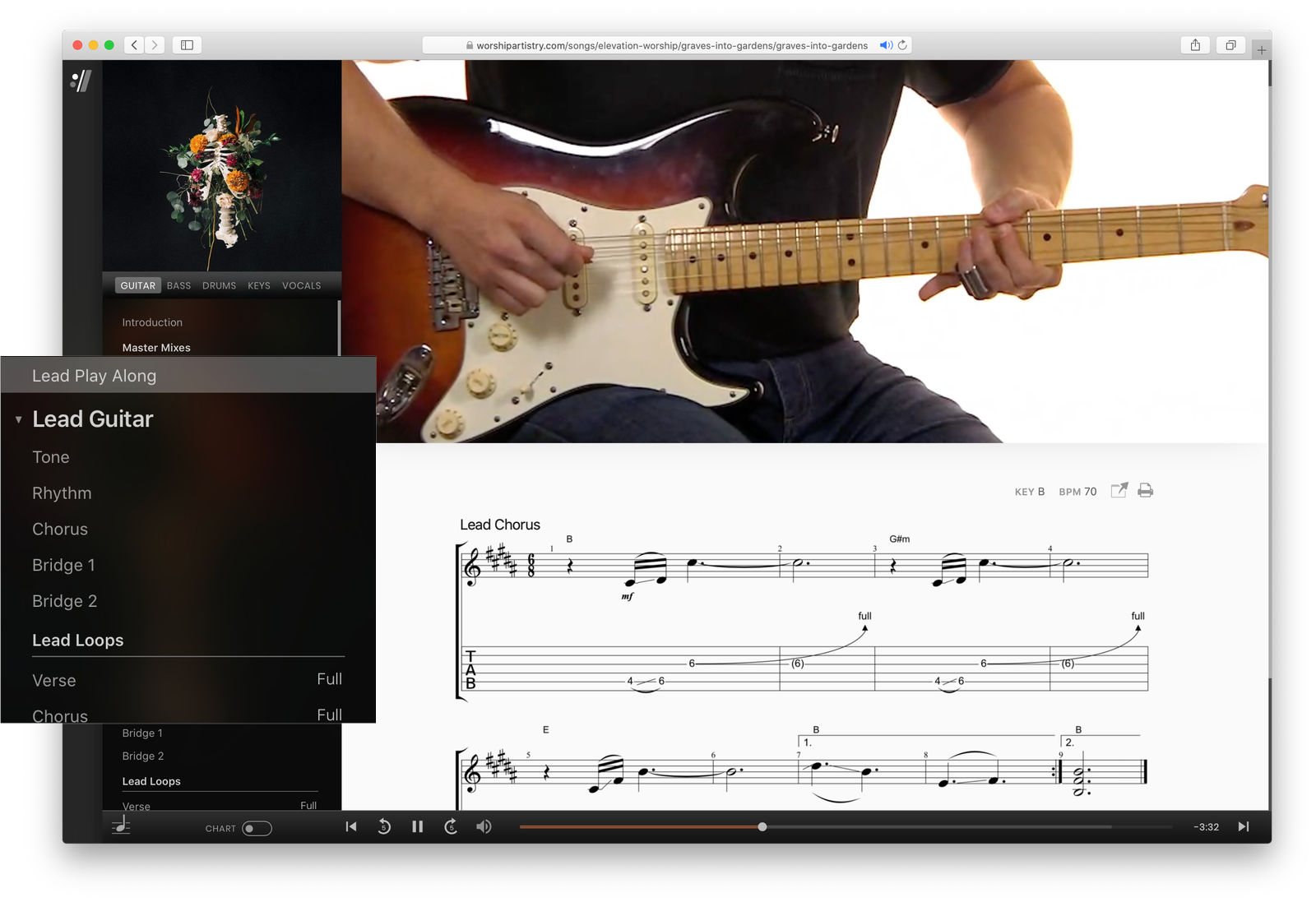 Prepare with our band so you can play with yours. Every song lesson features as much or as little instruction as you need. Watch detailed video teaching or jump right to the tabs, practice loops or rehearsal mix.