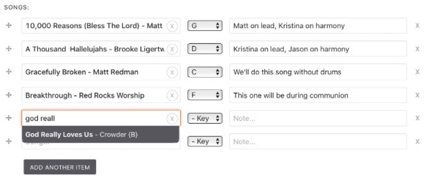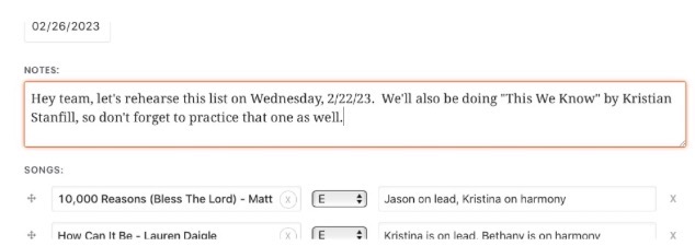 When you share this list with your team, they’ll be able to see the song’s new keys and notes. They can select the song to practice directly from this list. If there’s a song you’d like your team to practice, but it’s not in Worship Artistry’s library yet, simply specify it in the setlist notes.