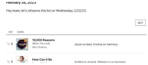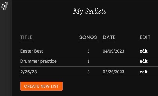 3. When you're in "My Setlists," select “edit” to change a list’s title, date, notes, songs, song keys, or rearrange the order of songs.