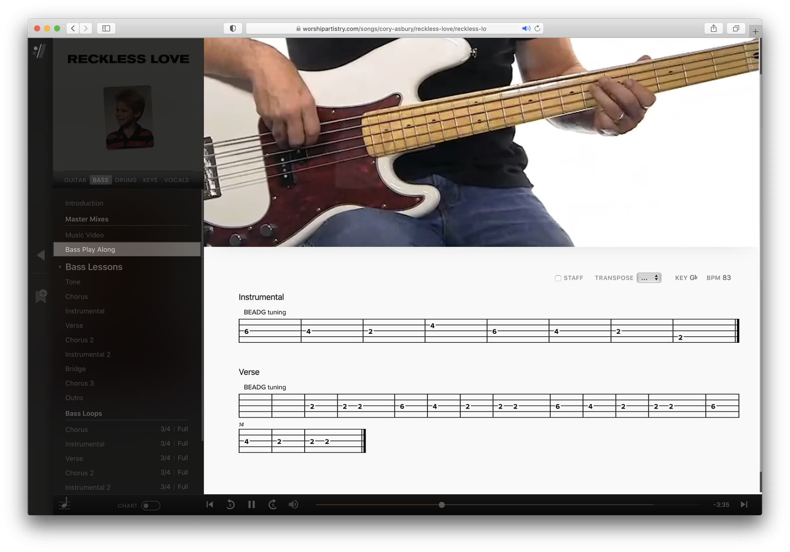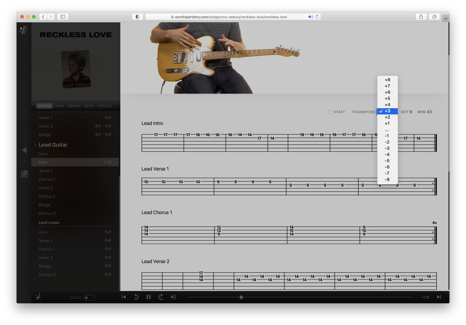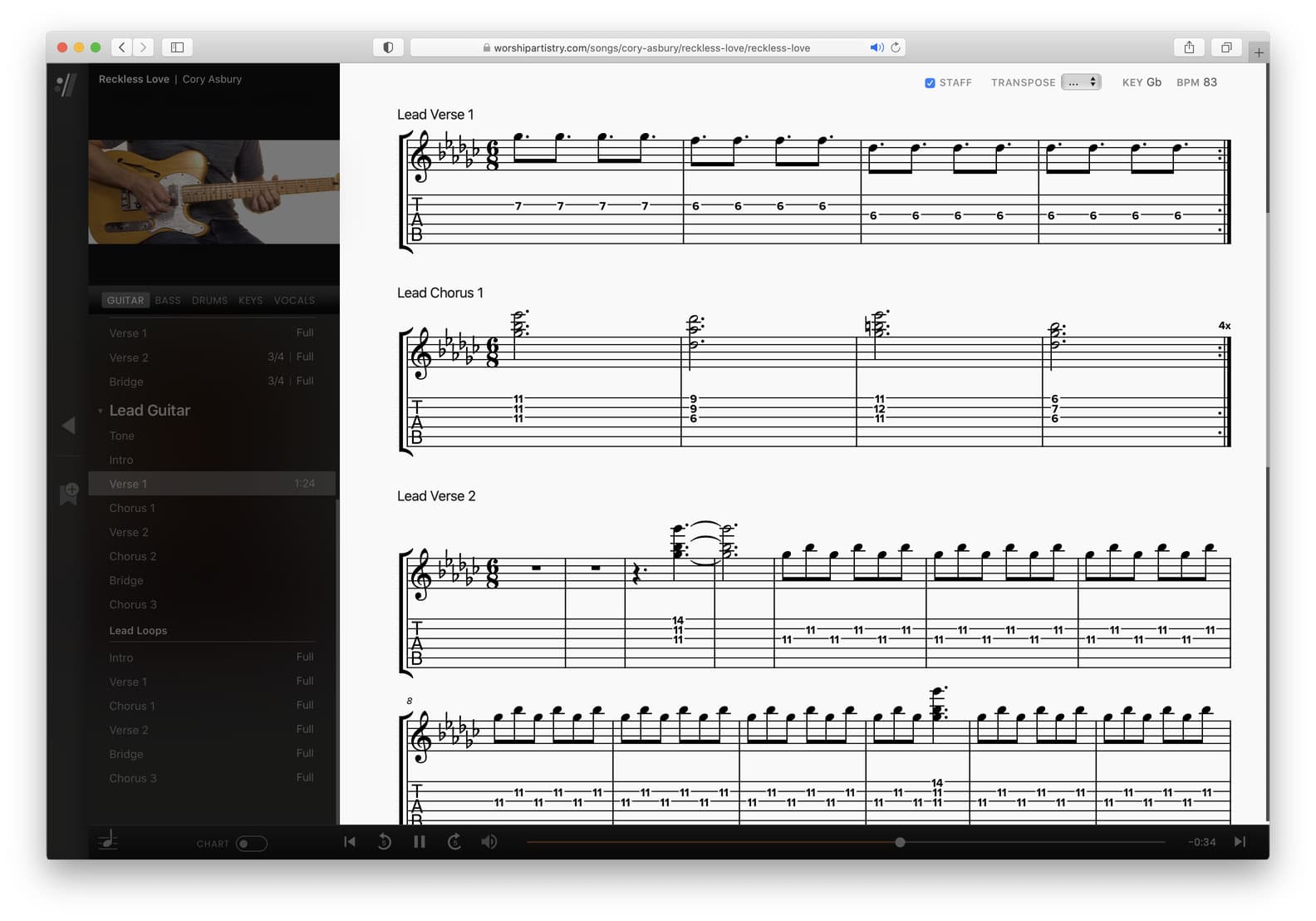 Transposable sheet music, tabs, and chord charts let you adjust your parts to fit this week's set. Check out the video to see it in action.