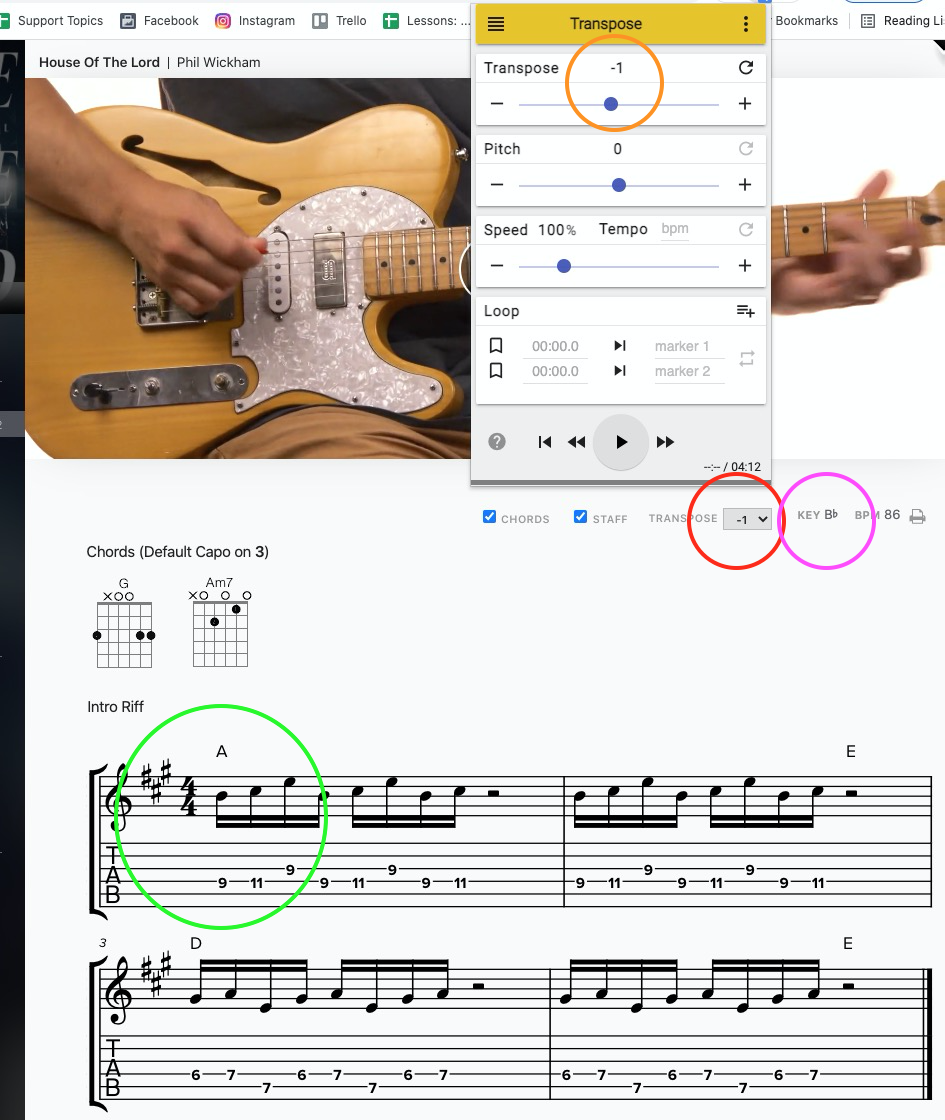 Let's use House of the Lord, for example. The original key is Bb (pink circle) but perhaps your team wants to sing it down a half step, in the key of A. Transpose the guitar tabs there in Worship Artistry (red circle). (Remember that each whole integer on the menu is a half step in the scale.) You'll see the new key in the tabs (green circle) but when you play the video, you will hear the audio of the Music Video in the original key, so use the Transpose Plugin to transpose the audio down a half step (orange circle).