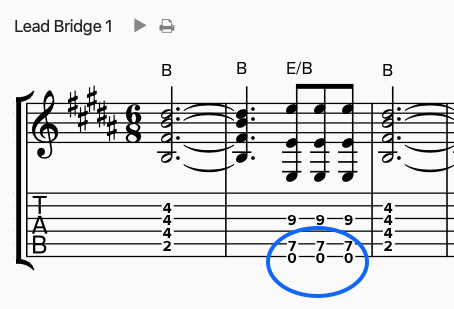 For instance, in this song below, the Lead Bridge 1 to this song can't be transposed down because the lowest note is that open E (blue circle). If you were to try to transpose this song down even one half step (-1) this Lead Bridge 1 won't change. It’s not that the transposer on Worship Artistry is broken, the issue is simply that it can’t be done automatically, and you’ll need to figure out which notes to play to transpose the whole song.